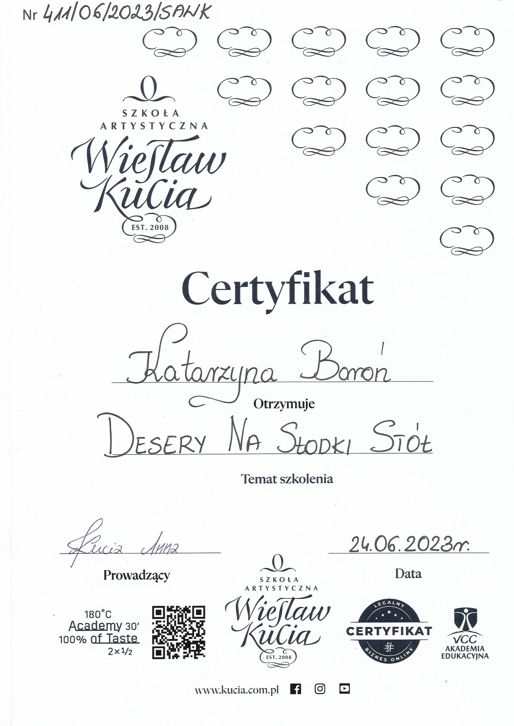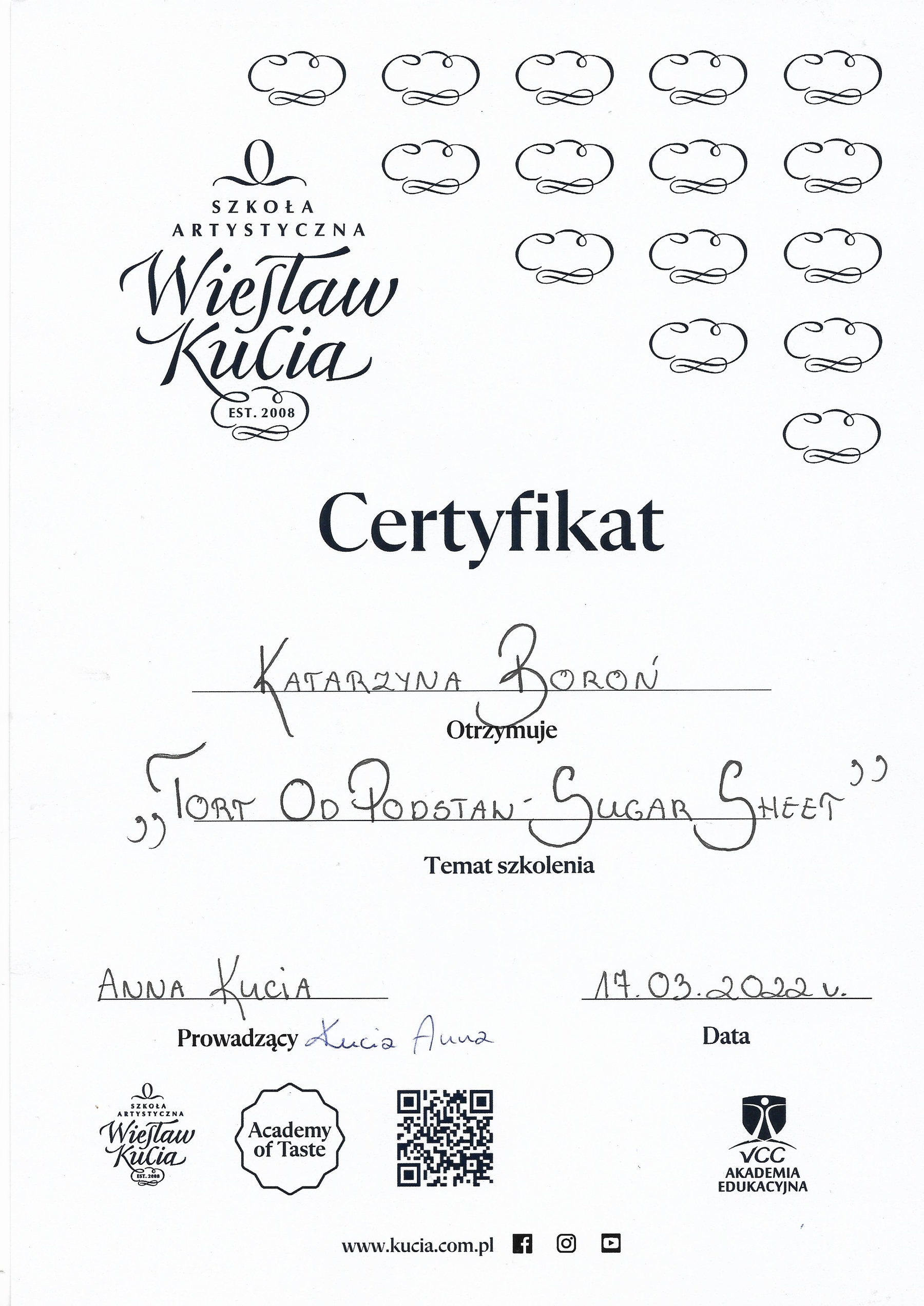 Cukiernictwo od dawna jest moją pasją. Postanowiłam pójść w tym kierunku i tak powstał w 2022r. Torcik. eu ale nim to się stało uczęszczałam na wiele kursów oraz szkoleń poszerzając swoją wiedzę. Kwalifikacje zawodowe potwierdziłam egzaminem w Izbie Rzemieślniczej w Lublinie.